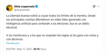 “La Libertad Avanza volvió a cruzar todos los límites de la mentira. Desde sus principales cuentas difundieron un video falso generado con inteligencia artificial para confundir a los electores. Eso es un delito electoral. A los mentirosos y a los que no respetan las reglas se les gana con votos y con decencia”, expresó la candidata del PRO, Silvia Lospennato en sus redes sociales.