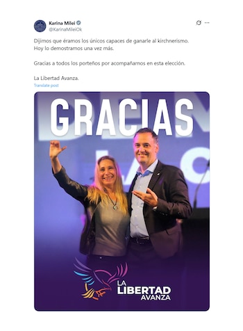A través de su cuenta de X, la hermana del primer mandatario también manifestó: “Gracias a todos los porteños por acompañarnos en esta elección. La Libertad Avanza”. Acompañó el posteo con una imagen en la que se la ve junto al vocero presidencial durante el acto de cierre de campaña.