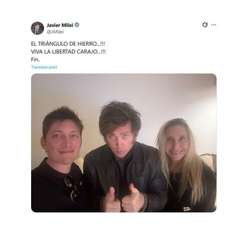 El presidente compartió la misma imagen que su hermana, con el mensaje “VIVA LA LIBERTAD CARAJO...!!! Fin”. Luego hizo un segundo tweet en el que destacó a su entorno más cercano: “EL TRIÁNGULO DE HIERRO...!!! VIVA LA LIBERTAD CARAJO...!!! Fin”, publicó en sus redes, con una selfie en la que aparecen el asesor Santiago Caputo y los hermanos Milei.