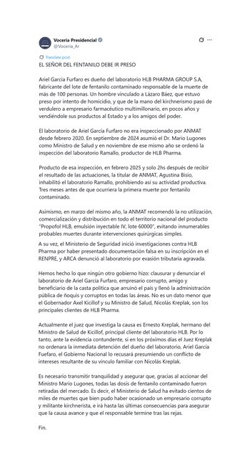 “El señor del fentanilo debe ir preso. Ariel García Furfaro es dueño del laboratorio HLB PHARMA GROUP S.A, fabricante del lote de fentanilo contaminado responsable de la muerte de más de 100 personas. Un hombre vinculado a Lázaro Báez, que estuvo preso por intento de homicidio, y que de la mano del kirchnerismo pasó de verdulero a empresario farmacéutico multimillonario, en pocos años y vendiéndole sus productos al Estado y a los amigos del poder“, señaló el mensaje que publicó la vocería presidencial.