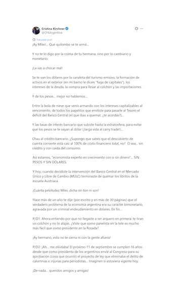 "¡Ay Milei!... Qué quilombo se te armó… Y no te lo digo por la coima de tu hermana, sino por lo cambiario y monetario. ¡La vas a chocar mal!“, comenzó el tuit que publicó la ex mandataria contra el actual jefe de Estado, en referencia a la polémica por las presuntas coimas que se habrían llevado a cabo en la Agencia Nacional de Discapacidad.