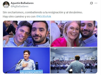 Agustín Balladares, destacaron fuentes partidarias, estuvo ayer en el acto que encabezó Axel Kicillof y en las últimas semanas se lo puede ver subiendo fotos de reuniones con el jefe de Gabinete bonaerense, Carlos Bianco, y el ministro Andrés “Cuervo” Larroque, entre otros. En sus redes sociales, el dirigente publicó fotos de su participación en el encuentro con Kicillof, donde habló de su proyecto 2027.