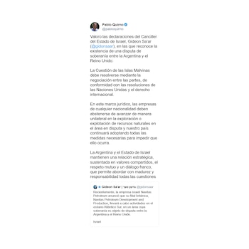 “Valoro las declaraciones del canciller del Estado de Israel, Gideon Saar, en las que reconoce la existencia de una disputa de soberanía entre la Argentina y el Reino Unido”, señaló Quirno, a través de su cuenta personal en la red social X. “La Cuestión de las Islas Malvinas debe resolverse mediante la negociación entre las partes, de conformidad con las resoluciones de las Naciones Unidas y el derecho internacional”, completó.