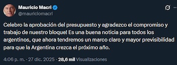 “Celebro la aprobación del presupuesto y agradezco el compromiso y trabajo de nuestro bloque”, afirmó Macri en una publicación en su cuenta de X, en la que resaltó que se trata de “una buena noticia para todos los argentinos”.