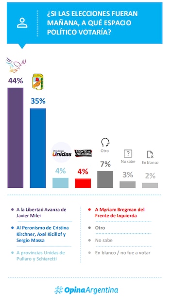 A su vez, en términos de intención de voto, La Libertad Avanza, sostiene una ventaja clara frente al peronismo: el 44 % elegiría la lista oficialista si las elecciones fueran mañana, seguido por el peronismo, representado por figuras como Cristina Kirchner, Axel Kicillof y Sergio Massa, que alcanza un 35 %. Otros espacios, como Provincias Unidas de Pullaro y Schiaretti, obtienen un 4 %.