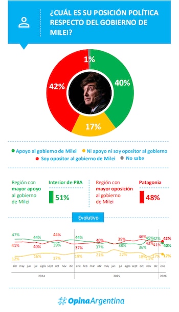 El estudio realizado por Opina Argentina abarcó a 3.590 habitantes de Argentina y reporta un margen de error de ±1,7 % con un nivel de confianza del 95 %. Según la publicación, revelaron que la popularidad presidencial se sostiene por tercer año consecutivo, en un escenario atravesado por opiniones divididas respecto al contexto social y político.