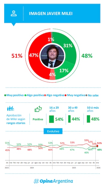 La encuesta indica que Milei cuenta con 48 % de imagen positiva (compuesta de votantes que expresan una opinión “muy positiva” o “algo positiva”), frente a un 51% de opiniones negativas o muy negativas. Analizando el respaldo etario, su aprobación es mayor entre los jóvenes de 16 a 29 años con el 54 % de respaldo, mientras que en el resto de las categorías este porcentaje cae apenas diez puntos para las personas de 30 a 49 y 50 años o más.