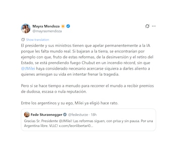 “El presidente y sus ministros tienen que apelar permanentemente a la IA porque les falta mundo real. Si bajaran a la tierra, se encontrarían por ejemplo con que, fruto de estas reformas, de la desinversión y el retiro del Estado, se está prendiendo fuego Chubut en un incendio récord, sin que @JMilei haya considerado necesario acercarse siquiera a darles aliento a quienes arriesgan su vida en intentar frenar la tragedia”, cuestionó la funcionaria, cercana a Cristina y Máximo Kirchner.