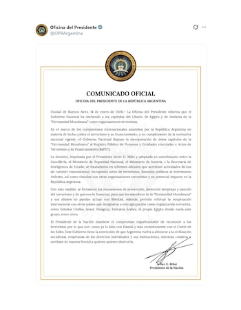 El presidente Javier Milei remarcó, indica el comunicado oficial, su “compromiso inquebrantable de reconocer a los terroristas por lo que son”, y recordó medidas previas adoptadas por su gestión contra Hamás y el Cártel de los Soles. La declaración de la Hermandad Musulmana como entidad terrorista se inscribe en la estrategia de reposicionar a la Argentina dentro de los países “alineados a la civilización occidental, respetuosa de los derechos individuales y sus instituciones”, en palabras de la Oficina del Presidente, que destacó la voluntad de combatir frontalmente a quienes buscan socavar esos valores.