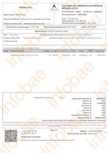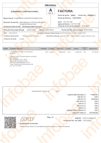 De acuerdo con la documentación a la que accedió Infobae de fuentes con acceso a la causa, las facturas incorporadas a la denuncia permiten observar cómo esas inconsistencias se traducen en comprobantes concretos, emitidos a nombre de la AFA, con conceptos genéricos y montos elevados, en el marco de decisiones administrativas adoptadas durante la presidencia de Tapia.