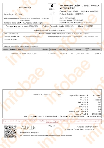 En el caso de Belesan S.A., la denuncia incorpora una factura emitida el 11 de junio de 2023, bajo la modalidad de FCE, por un monto de 4.299.999,99 pesos, con el concepto “obras realizadas en predio Ezeiza”.