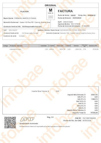La denuncia también incorpora comprobantes de proveedores de menor envergadura, como PLACSUR, con una Factura M por 78.720 pesos correspondiente a “materiales en seco”. Aunque los montos son marginales, ARCA observa que la lógica documental es la misma y que el destinatario de los pagos es siempre la AFA.