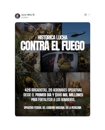 En horas marcadas por el avance de los incendios en el sur del país, Javier Milei comunicó a través de sus redes sociales los detalles del Operativo Federal desplegado por el Gobierno nacional en la Patagonia. El mandatario destacó la magnitud de la estrategia estatal, a la que calificó como una “histórica lucha contra el fuego”, y enumeró los recursos movilizados: “426 brigadistas, 20 aeronaves operativas desde el primer día y 100 mil millones de pesos para fortalecer a los bomberos”. El anuncio se conoció en un contexto de máxima tensión en las provincias afectadas, donde el avance de las llamas ya devastó 45 mil hectáreas.