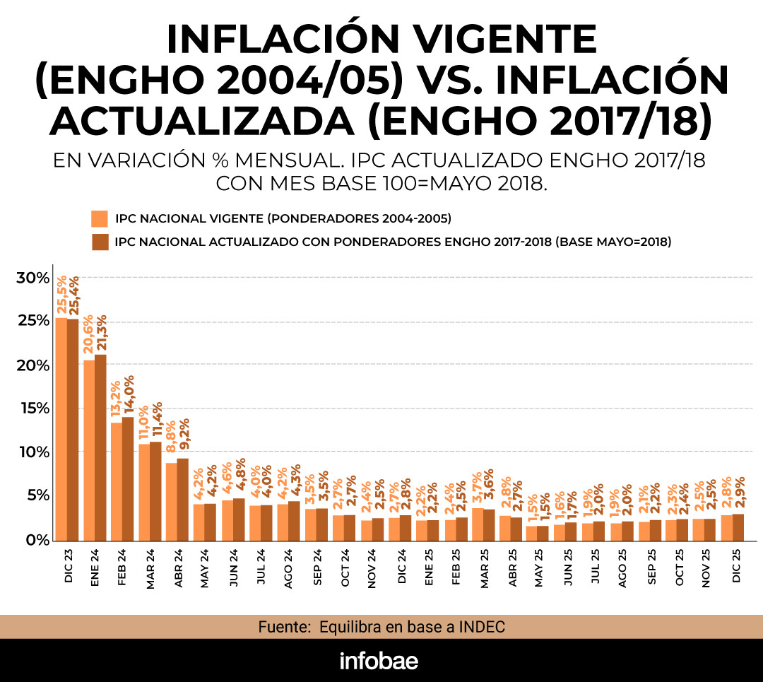 La nueva canasta, resultado de la Encuesta Nacional de Gastos de los Hogares (ENGHo) 2017-2018, reemplazará a la que se aplica desde 2004, con el objetivo de captar con mayor precisión los hábitos actuales de consumo. Según un informe de Qualy, el impacto más notorio recaerá en el peso de los servicios públicos, dado que Vivienda, Agua, Electricidad y otros combustibles pasarán de una incidencia del 9,4% al 14,5% en el índice, mientras que Transporte subirá de 11% a 14,3%, Comunicaciones de 2,8% a 5,1% y Educación de 2,3% a 3,1%. En contraste, Alimentos y Bebidas disminuirán de 26,9% a 22,7%. Los expertos de Qualy puntualizaron que “la disminución del peso de los alimentos reduce la sensibilidad del IPC frente a variaciones estacionales y climáticas, así como a la volatilidad de los mercados internacionales de materias primas”.