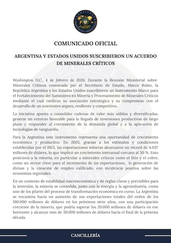 En tanto, el canciller Pablo Quirno compartió en sus redes sociales un mensaje tras la firma del acuerdo: “Hoy firmé, en representación de Argentina, un Acuerdo sobre Minerales Críticos con los Estados Unidos: más exportaciones, más inversiones y más empleo para nuestro país. Gracias, Christopher Landau, por el trabajo conjunto y el compromiso para seguir fortaleciendo esta asociación estratégica”.