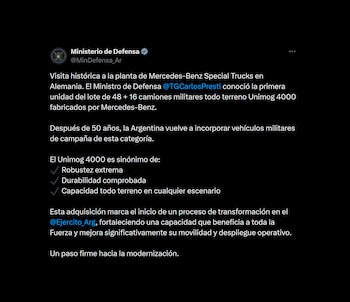 A través de una comunicación oficial, destacaron la visita como “histórica” y remarcaron que Presti “conoció la primera unidad del lote de 48 + 16 camiones militares”. “Después de 50 años, la Argentina vuelve a incorporar vehículos militares de campaña de esta categoría. El Unimog 4000 es sinónimo de robustez extrema, durabilidad comprobada, capacidad todoterreno en cualquier escenario”, agregaron.