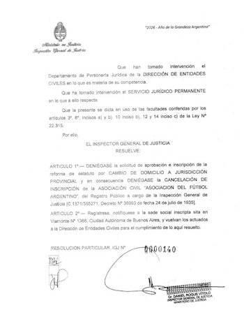 En otro expediente vinculado, la AFA solicitó la convalidación de decisiones adoptadas en la Asamblea de octubre de 2025, celebrada bajo fiscalización de autoridades bonaerenses. La IGJ no admitió la validez de esa asamblea y exigió que se subsane mediante la realización de un acto que cumpla con los requisitos establecidos por la normativa nacional. De este modo, el organismo no solo rechaza el cambio de domicilio, sino que además pone en duda la eficacia de actos societarios adoptados bajo la presunta nueva jurisdicción.