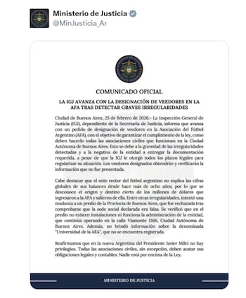 En un comunicado, el Ministerio de Justicia informó en un comunicado que “la IGJ avanza con la solicitud de veedores en la AFA debido a la gravedad de las irregularidades”. La respuesta desde la Asociación del Fútbol Argentino provino del abogado Gregorio Dalbón: “La IGJ puede fiscalizar. Lo que no puede es convertir una facultad de control en una herramienta de presión política”.