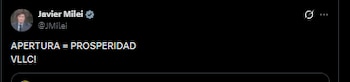 El presidente Javier Milei replicó el mensaje y lanzó un breve mensaje: “APERTURA = PROSPERIDAD. VLLC!”. Además, el ministro de Economía, Luis “Toto” Caputo también retuiteó el posteo de Quirno y añadió: “TMAP”, en relación con la sigla que utilizan los libertarios en referencia a “todo marcha acorde al plan”.