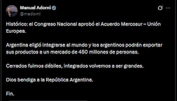 Y el ministro de Interior, Diego Santilli, continuó en esa línea: “Aprobado el acuerdo Mercosur–Unión Europea. Un paso más hacia una Argentina integrada al mundo, con más comercio y más inversión, de la mano de @JMilei”.