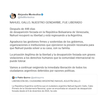Desde el Ministerio de Seguridad Nacional, Alejandra Monteoliva celebró la recuperación de la libertad de Nahuel Gallo tras 448 días de desaparición forzada en Venezuela y agradeció las gestiones realizadas para que el gendarme pudiera regresar con su familia. “Agradezco las gestiones firmes y sostenidas de los gobiernos, organizaciones e instituciones que ejercieron la presión necesaria para que Nahuel pueda volver a su casa, con su familia”, afirmó la ministra.
