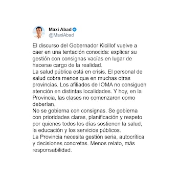 El senador nacional Maximiliano Abad cuestionó el enfoque del mandatario: “El discurso del Gobernador Kicillof vuelve a caer en una tentación conocida: explicar su gestión con consignas vacías en lugar de hacerse cargo de la realidad. La salud pública está en crisis. El personal de salud cobra menos que en muchas otras provincias. Los afiliados de IOMA no consiguen atención en distintas localidades".