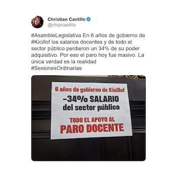 Desde la izquierda, Christian Castillo, diputado provincial por el Frente de Izquierda Unidad, centró su mensaje en la pérdida de poder adquisitivo de los estatales: “En 6 años de gobierno de #Kicillof los salarios docentes y de todo el sector público perdieron un 34% de su poder adquisitivo. Por eso el paro hoy fue masivo. La única verdad es la realidad”.