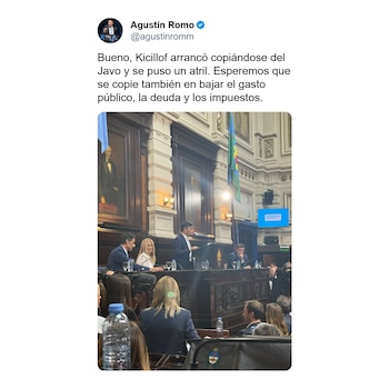 Desde el bloque La Libertad Avanza, Agustín Romo también se sumó a las críticas. “Bueno, Kicillof arrancó copiándose del Javo y se puso un atril. Esperemos que se copie también en bajar el gasto público, la deuda y los impuestos”, expresó el presidente de ese bloque en la Cámara de Diputados de la provincia.