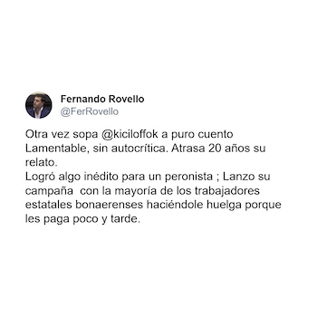 Fernando Rovello, diputado provincial por el PRO, también se refirió al acto: “Otra vez sopa Kiciloff a puro cuento. Lamentable, sin autocrítica. Atrasa 20 años su relato. Logró algo inédito para un peronista; lanzó su campaña con la mayoría de los trabajadores estatales bonaerenses haciéndole huelga porque les paga poco y tarde”.