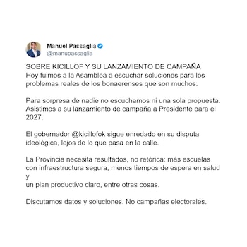 El diputado provincial por HECHOS, Manuel Passaglia, planteó: “Hoy fuimos a la Asamblea a escuchar soluciones para los problemas reales de los bonaerenses que son muchos. Para sorpresa de nadie no escuchamos ni una sola propuesta. Asistimos a su lanzamiento de campaña a Presidente para el 2027. El gobernador sigue enredado en su disputa ideológica, lejos de lo que pasa en la calle. La Provincia necesita resultados, no retórica: más escuelas con infraestructura segura, menos tiempos de espera en salud y un plan productivo claro, entre otras cosas. Discutamos datos y soluciones. No campañas electorales”.
