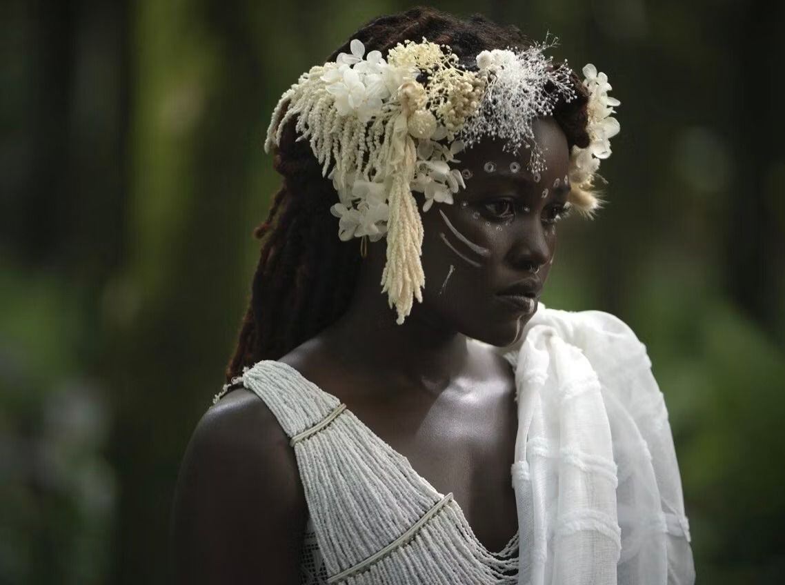 En la otra fotografía se ve solamente a Nakia con una vestimenta blanca, la cual según ha mostrado el trailer de la película, sería el atuendo ceremonial para despedir al rey T’Challa. Además de lucir adornada con flores blancas y pintura facial, luciendo solemne.