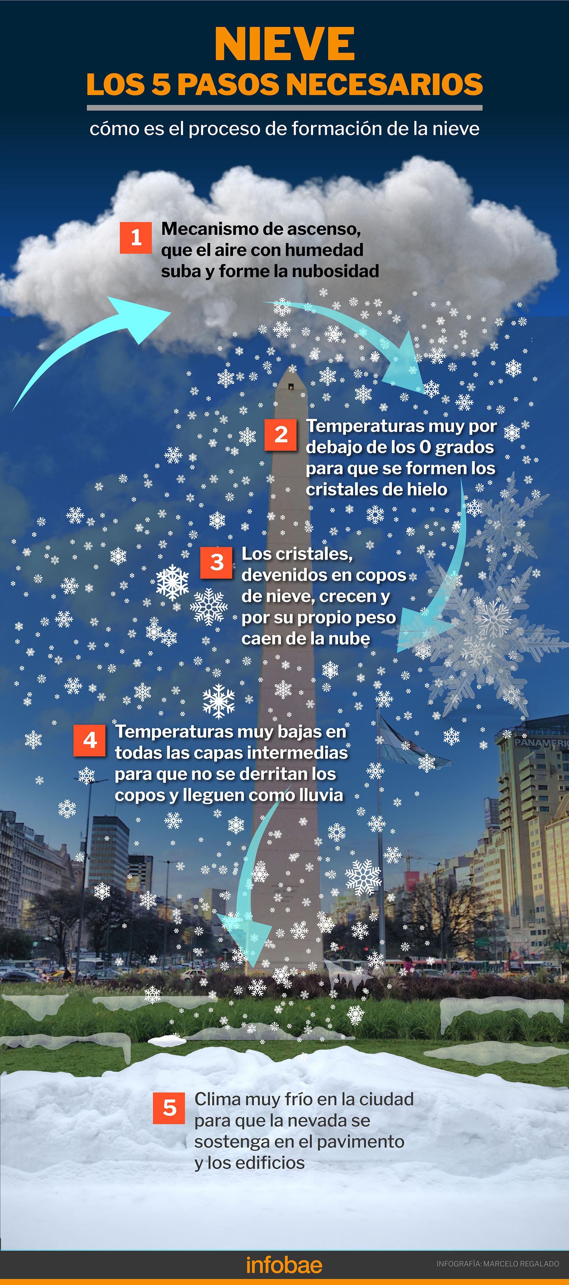 Una vez que se forma la nubosidad, siguió el meteorólogo, dentro de las nubes se tienen que generar cristales de hielo. Para eso se necesitan temperaturas muy por debajo de los 0 grados. Los cristales deben crecer en su tamaño tanto que, devenidos en copos de nieve, empiecen a caer por su propio peso. “Se vuelven tan pesados que ya el aire dentro de la nube no los puede sostener más y comienzan a precipitar”, indicó.