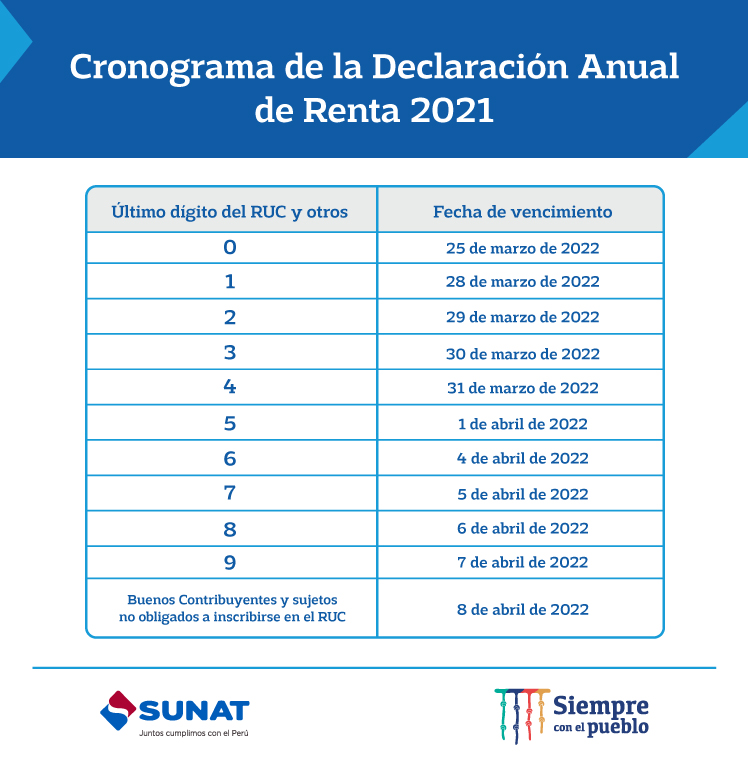 С этой целью Сунат установил график с указанием сроков, к которым он сможет вернуться. Крайний срок подачи годовой декларации о подоходном налоге за 2021 год начнется 25 марта и закончится 8 апреля 2022 года. Даты платежей соответствуют последней цифре ККО налогоплательщика.