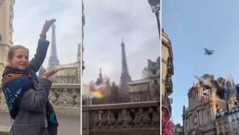 На снимках видно, как женщина фотографируется перед Эйфелевой башней, и в это время на памятник падают бомбы. Вы можете услышать оскорбления из-за урчания и плача ребенка. «Боже мой, иди и смотри, иди и увидишь», — слышишь, как человек говорит посреди бомбардировки.