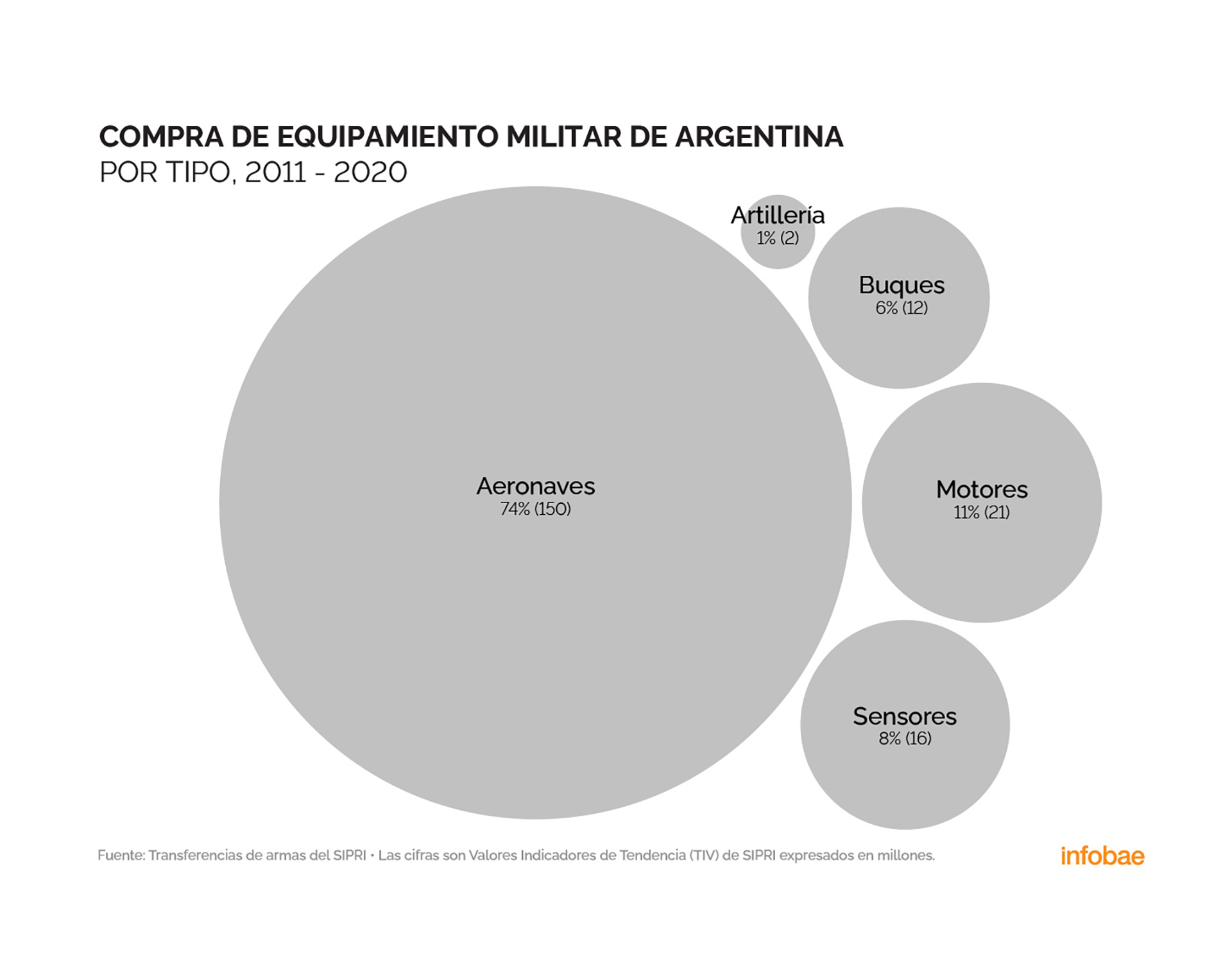 Отдел данных Infobae проанализировал закупки военной техники в Аргентине и соседних странах за последнее десятилетие на основе данных SIPRI, некоммерческой организации, базирующейся в Стокгольме, которая сформировала глобальную базу военных закупок. Цифры ставят Аргентину на середину таблицы в Латинской Америке.