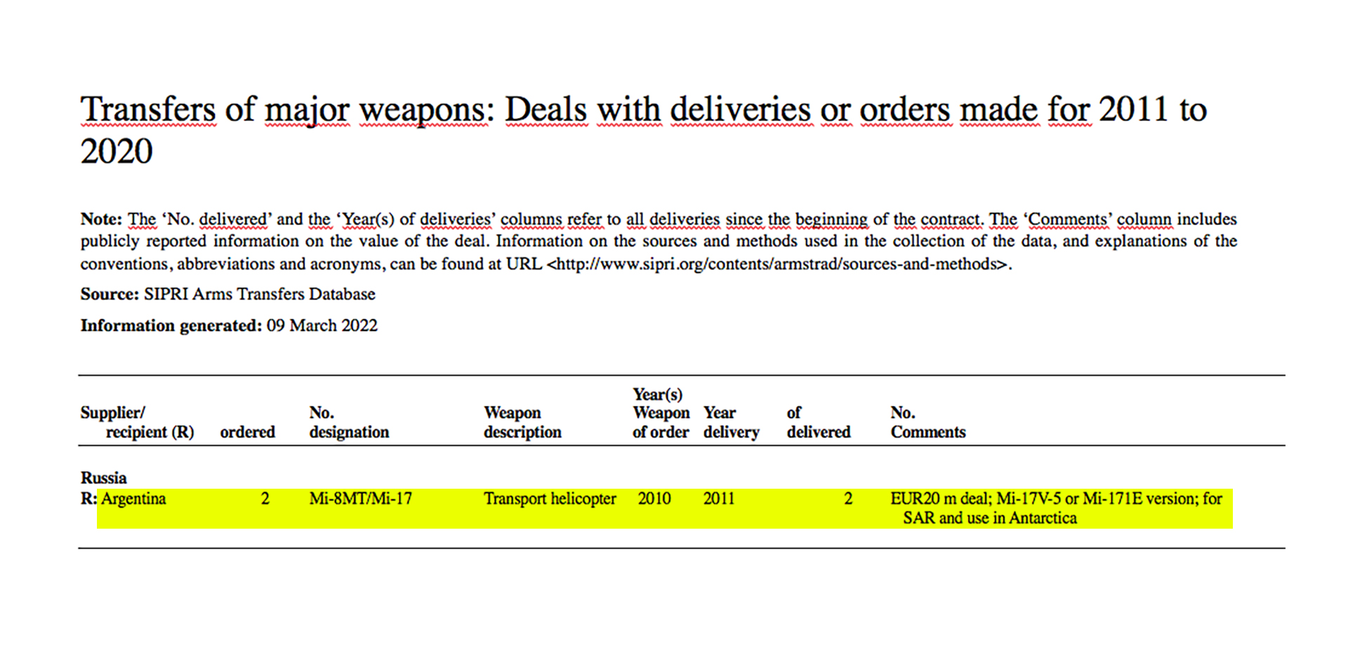 Согласно документам, собранным Sipri, правительство приобрело два вертолета Ми-17 у российского государственного «Рособоронэкспорта» на общую сумму 20 миллионов евро. Самолеты, которые обычно используются для логистики, грузов и скрапбукинга, были приобретены для операций на аргентинской базе в Антарктиде, а также для спасательных задач, подробности Sipri. Вертолеты, которые использовались, могут перевозить около 25 пассажиров и готовы нести внешнюю нагрузку до пяти тонн.