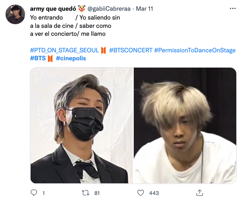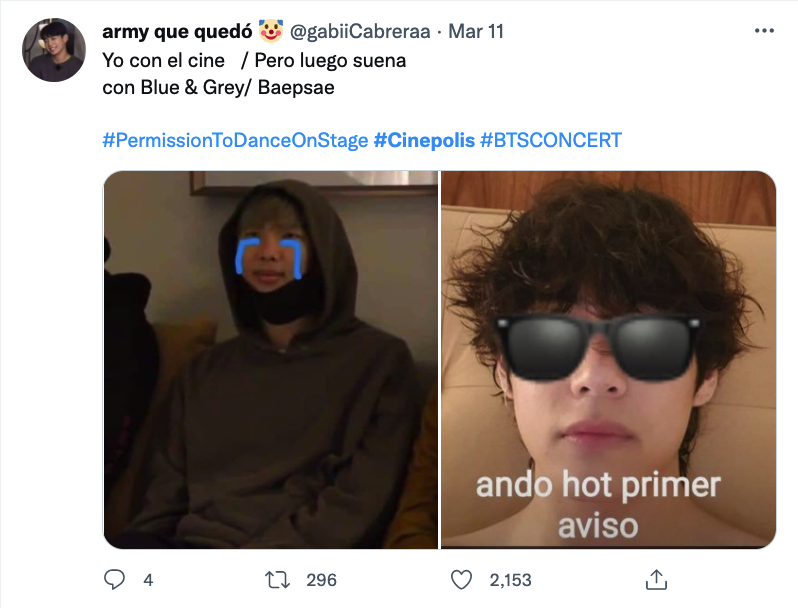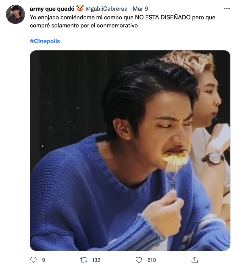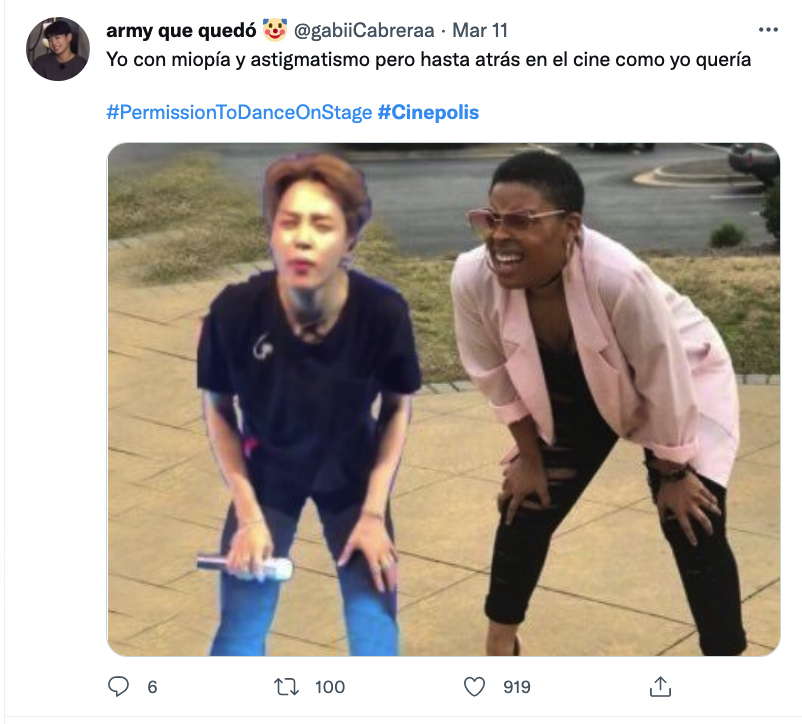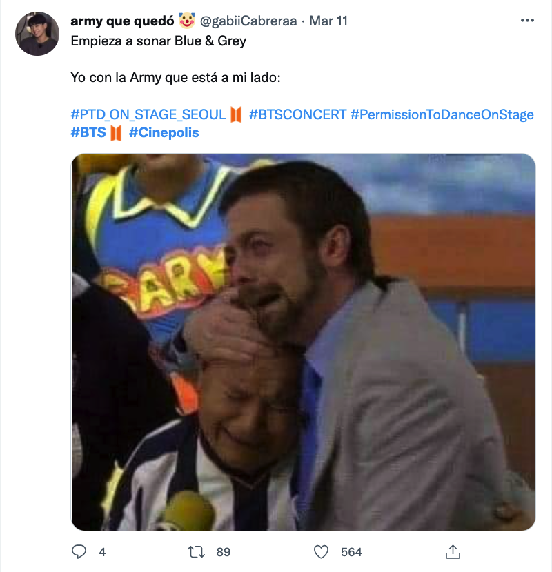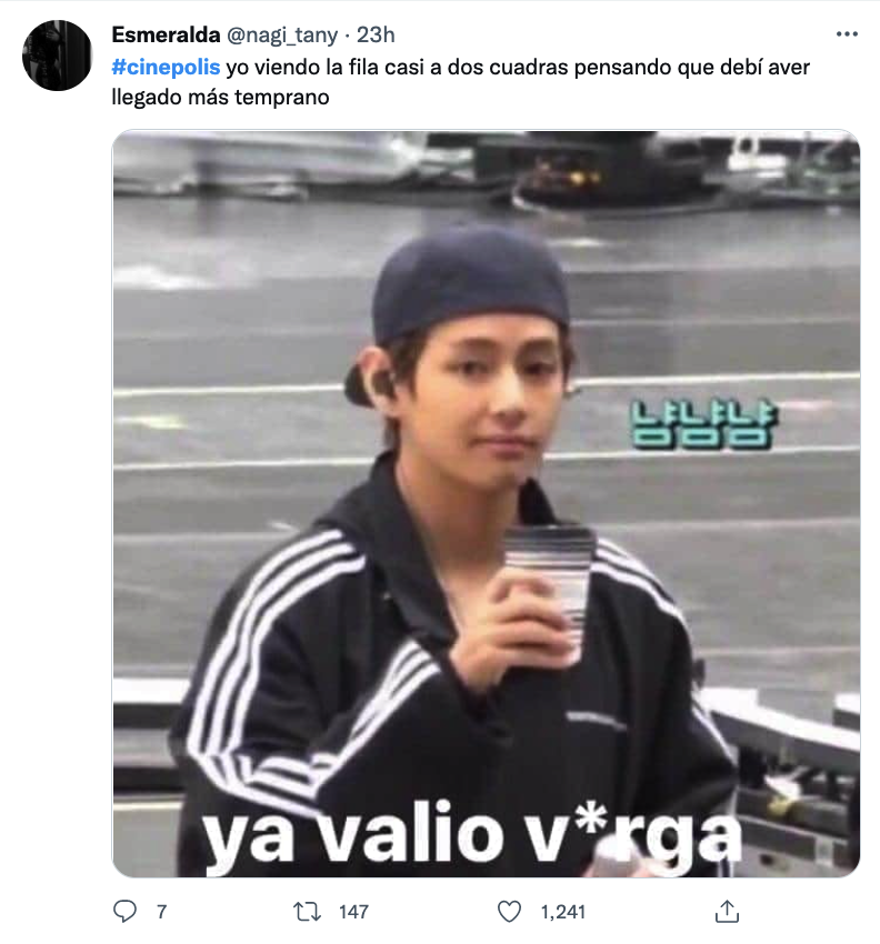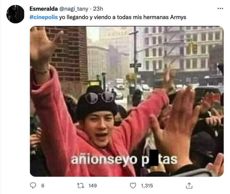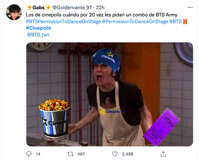 Между тем, некоторые другие мемы издевались над ситуациями вне концерта, такими как длинные очереди за пределами кинотеатра, гнев на памятное комбо Cinépolis или радость от совместного использования одного и того же пространства с другими армиями.