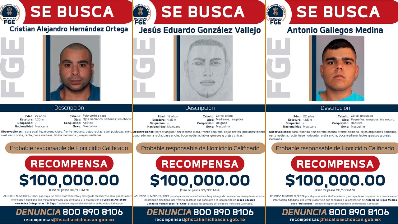 Каждому из предполагаемых преступников предлагается вознаграждение в размере 100 000 песо в случае обмена информацией, которая поможет определить их местонахождение или поимку. Идентифицированные субъекты: Абель Алкантар Н, Эль-Вьехон или Эль Торо; Хесус Адриан Н, Эль-Мора; Кристиан Алехандро Н, Эль-Сапо, Антонио Гальегос Н., Ла Болачана, Хесус Эдуардо Н., Эль Чили и Хуан Мануэль Н., Эль Раш.