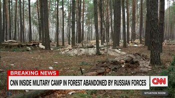 Теперь среди деревьев остались только остатки этого огромного военного лагеря. Украинский спецназ показал CNN лагерь и собирает улики из завалов о возможных планах России в Киеве.
