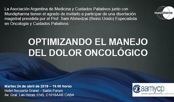 Hoy a las 19:00hs, la Asociación Argentina de Medicina y Cuidados Paliativos (AAMYCP) junto con Mundipharma invitan a participar de una disertación magistral sobre el manejo del Dolor Oncológico presidida por el profesor Sam Ahmedzai, especialista en Oncología y Cuidados Paliativos, en el Hotel Recoleta Grand- Salón Forum- (Avenida Las Heras 1745, CABA).