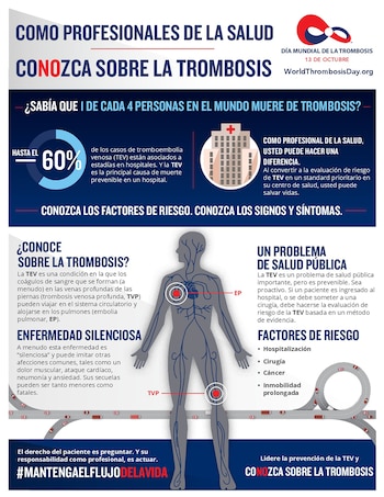 En los Estados Unidos y en Europa, las situaciones relacionadas a la tromboembolia venosa causan más muertes y discapacidades que el cáncer de mama, de próstata, el sida y los accidentes automovilísticos, todos combinados. Si bien la TEV es potencialmente fatal, la mayoría de los casos se pueden prevenir con conocimiento de los factores de riesgo (movilidad reducida temporal o crónica, sometimiento a una cirugía, padecimiento de cáncer, historia familiar de TEV, medicamentos con estrógeno, embarazadas o mamás recientes) y síntomas (dolor y/o sensibilidad en la pantorrilla o el muslo, hinchazón de la pierna, el pie y/o el tobillo, enrojecimiento y/o decoloración notable y calor).