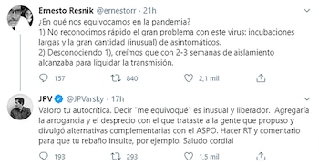 Entre las respuestas que tuvo la publicación en las redes sociales, se destacó la de Juan Pablo Varsky: “Valoro tu autocrítica. Decir me equivoqué es inusual y liberador. Agregaría la arrogancia y el desprecio con el que trataste a la gente que propuso y divulgó alternativas complementarias con el ASPO. Hacer RT y comentario para que tu rebaño insulte, por ejemplo”, publicó el periodista, al recordar una crítica del científico a un contenido que compartió en su cuenta personal. A partir de ahí se generó un fuerte intercambio de cuestionamientos entre ambos.