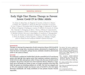 El paper publicado hoy en la prestigiosa revista científica The New England Journal of Medicine y titulado Terapia temprana con plasma alto en títulos de anticuerpos para prevenir COVID-19 severo en adultos mayores, al que Infobae pudo acceder muestra los resultados del estudio realizado por el equipo de científicos de la Fundación Infant, liderado por el infectólogo argentino Fernando Polack , y donde se destacan como cabezas de la investigación, los expertos infectólogos Romina Libster y Gonzalo Pérez Marc .