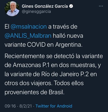 Lo confirmó por Twitter el ministro de Salud de la Nación, Ginés González García. “Estos hallazgos remarcan la importancia de la implementación de una vigilancia epidemiológica genómica activa para monitorear la introducción de estas variantes en nuestro país”, remarcó el funcionario.