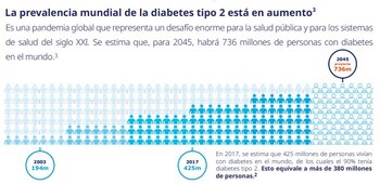 Entre los riesgos que supone padecer esta enfermedad, las personas con diabetes tienen entre dos a tres veces más infartos de miocardio y ACV que aquellas que no la tienen. Las estadísticas a nivel global indican que la proporción de personas con diabetes tipo 2 se incrementa en casi todos los países y coinciden en que 1 de cada 2 personas que padecen diabetes no están diagnosticadas. En línea con ello, menos del 50% de las personas con la enfermedad tienen un buen control glucémico.