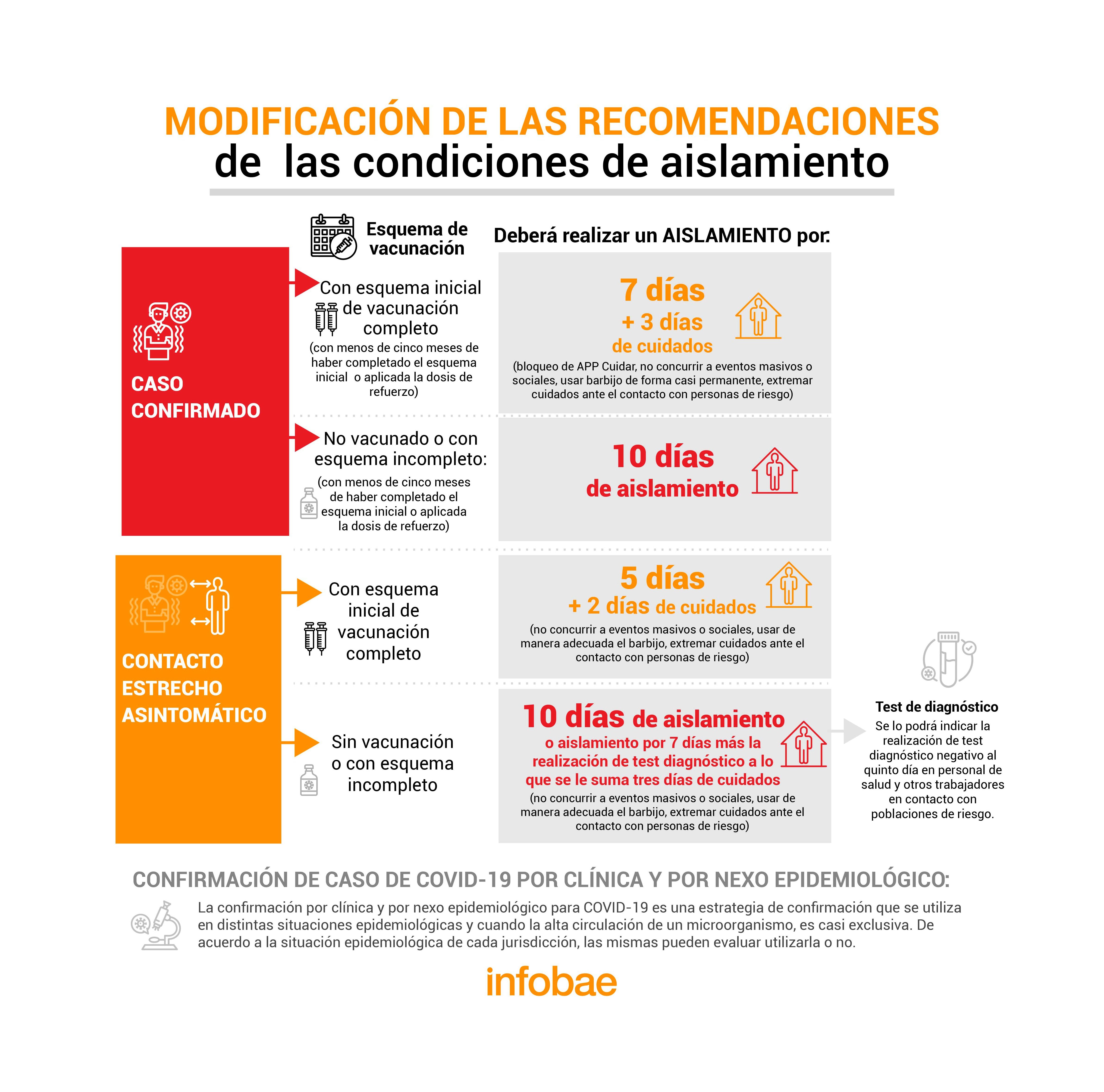Para la médica Gabriela Ensinck, de la comisión de Infectología de la Sociedad Argentina de Pediatría (SAP), “los CDC establecieron ahora solo 5 días de aislamiento para las personas con COVID-19 y para los contactos estrechos con vacunación completa y dosis de refuerzo. “Se basan en que suman las 48 horas previas a que la persona tenga los síntomas de la infección y los 3 días siguientes. También los contactos estrechos solo tienen que aislarse 5 días. Es para personas ya vacunadas completamente”.