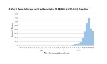 El Ministerio de Salud de la Nación informó en al tarde de este sábado que hasta la semana epidemiológica 15 de 2023 (es decir hasta el 16/04) se notificaron en el país 56.324 casos de dengue, de los cuales 51.634 adquirieron la infección en la Argentina. Al momento, la circulación de este virus se ha identificado en 15 jurisdicciones correspondientes a cuatro regiones: Región Centro (Buenos Aires; Ciudad Autónoma de Buenos Aires; Córdoba; Entre Ríos; Santa Fe); región NEA (Corrientes; Formosa; Chaco), región NOA (Catamarca; Jujuy; La Rioja; Salta; Santiago del Estero; Tucumán) y la provincia de San Luis en la región Cuyo.