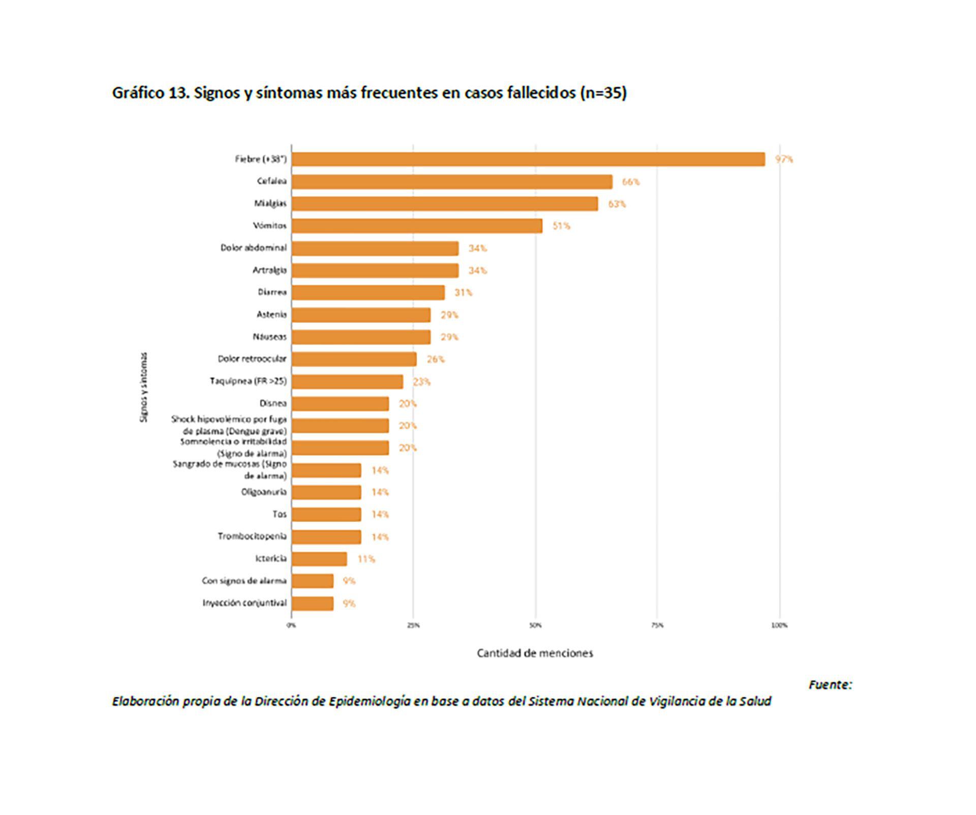 - Cualquiera de los siguientes signos de alarma: dolor abdominal intenso o dolor a la palpación del abdomen, vómitos persistentes, acumulación de líquidos (ascitis, derrame pleural, derrame pericárdico), sangrado de mucosas, letargo / irritabilidad, hipotensión postural (lipotimia), hepatomegalia (agrandamiento del hígado por encima de su tamaño normal) mayor a dos centímetros, aumento progresivo del hematocrito.