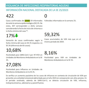 Desde el Ministerio de Salud resaltan que, respecto al COVID, el porcentaje de positividad para SARS-CoV-2 continúa presentando valores bajos, siendo de 10,68% actualmente. Y yendo un poco más atrás, en términos acumulados, entre la Semana Epidemiológica (SE) 23 del 2022 a SE25/2023, se notificaron 195.998 muestras estudiadas para SARS-CoV-2 en casos hospitalizados, de las cuales 23.705 fueron positivas (porcentaje de positividad 12,09%).