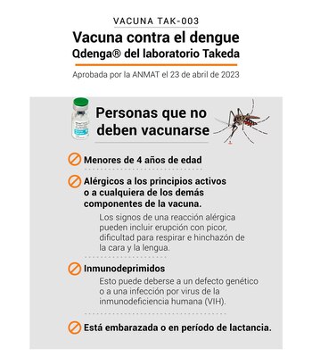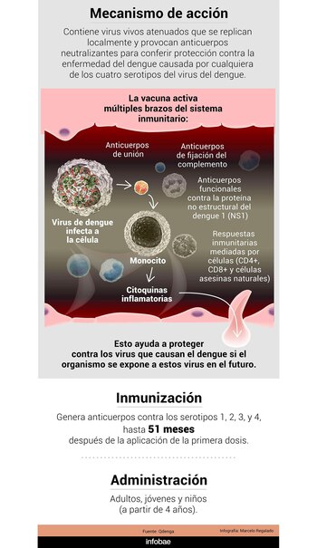 En declaraciones recientes a Infobae, el doctor Eduardo López, jefe del Departamento de Medicina del Hospital de Niños Ricardo Gutiérrez y director de la Carrera de Especialistas en Infectología Pediátrica de la Facultad de Medicina (UBA), señaló: “En Argentina la vacuna está aprobada de 4 a 100 años. Otros países lo han aprobado de 4 a 65 años, otros de 4 a 64 años, porque el laboratorio Takeda ha hecho estudios hasta 64 años”.